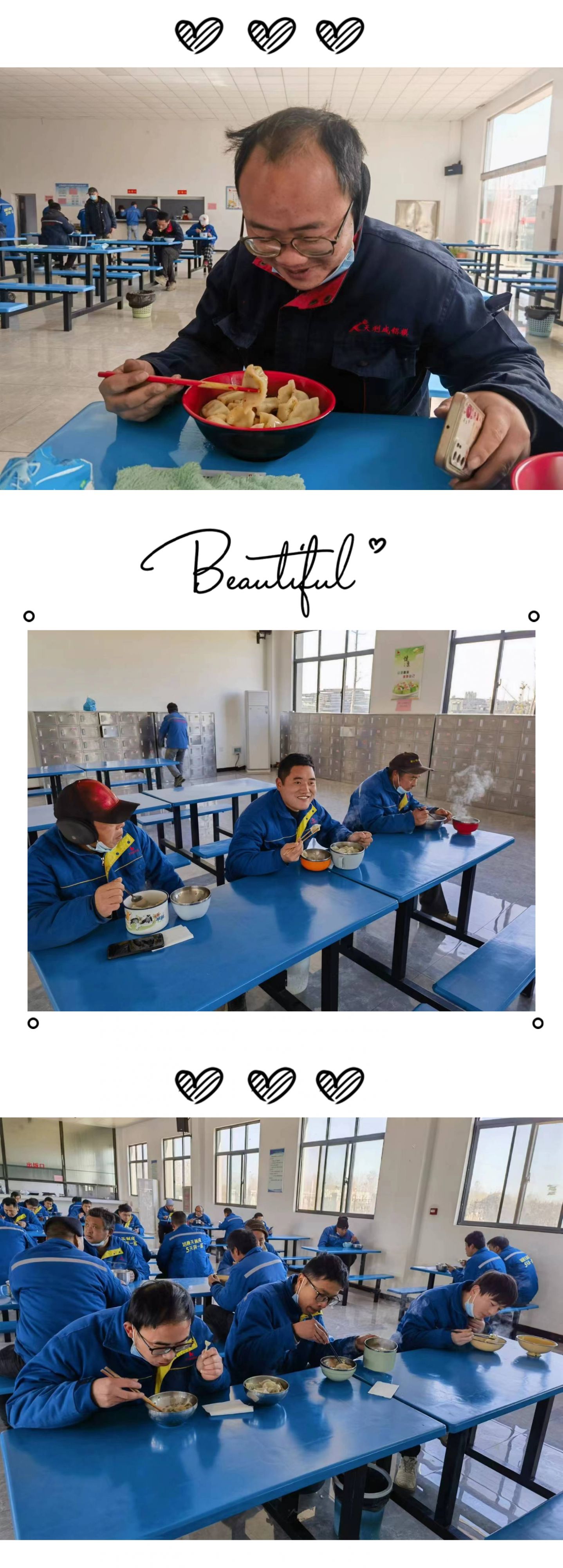 我們的廚師一大早就準備好包餃子的材料,大家分工協(xié)作,圍在廚房、圍在員工餐廳,你搟皮兒、他包餃子,一手拿起餃子皮,一手填餡,雙手合攏一捏,一個個形態(tài)各異的餃子就成型了;有些還不太會包餃子的家人在家人的幫助下也學會了如何包餃子。大家配合默契,歡聲笑語,擁有著勝似家人的其樂融融。不一會兒功夫,一排排個性十足、整齊劃一的餃子就大功告成。當午餐時分家人們圍坐在一起津津有味地吃著親手包的餃子,連連豎起大拇指贊不絕口,雖然只是一份普普通通的餃子,但它不僅驅(qū)走了冬日的嚴寒,更讓大家心里暖意倍升,一份餃子,一份關愛,一份情意,一種文化。在此,特別感謝后勤家人們的辛勤付出!